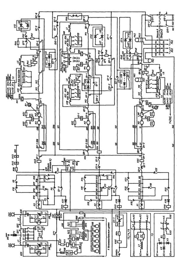 2-я цепь: питание ТЭДЗ,4 — от плюсового вывода x1 нерегулируемой обмотки трансформатора, по шине В82, через контакторы 32 и 33 ПО ЭКГ, по шине В85, по всем четырем секциям регулируемой обмотки трансформатора 01-1 против их ЭДС, по шине В83, через контактор 11 ПС ЭКГ, через контактор с дугогашением А ЭКГ, по шине В5, по одному плечу xl-01 ПРА 25, по шине В1, через крайний нож разъединителя 82, через плечо 2 ВУ 62, по шине В403, далее по двум параллельным цепям ТЭДЗ и ТЭД4, по шине В56, через СР 56, через плечо 4 ВУ 62, через другой крайний нож разъединителя 82, по шине В13, по силовым шинам дифференциальных реле 22 и 21, по шине В2 к минусовому выводу a1 нерегулируемой обмотки трансформатора.
