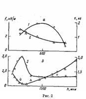 При этом зависимость максимальных значений f от hпокрытий описывается кривой с максимумом (рис. 3, а, кривые 1,3), что можно объяснить уменьшением толщины окисленного граничащего с подложкой слоя полимера. Известно [13], что зависимость прочности соединений металлов с полимерами от толщины промежуточного тонкого окисленного полимерного слоя описывается кривой с максимумом. Определенную роль при этом может играть аморфизация граничащего с подложкой слоя полимера. Для толстых покрытий (1200 мкм и более) максимум величины f смещается в область больших значений τ при увеличении h(рис. 1, б, кривые 8—10),