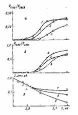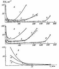 На рис. 1 представлены данные по влиянию т при различных температурах окисления на величину f для покрытий различной толщины на стали. Зависимость f от т при постоянных hи Т описывается кривой с максимумом. При увеличении hпокрытий значение т, соответствующее максимуму f на изотермической кривой, сначала уменьшается, а затем увеличивается (рис. 1; рис. 2, б, кривая 4), в то время как для покрытий на каталитически неактивной подложке (алюминий [5]) оно только увеличивается [1]. Вследствие этого зависимость величины f покрытий на стали от hдля постоянных Т и τ описывается при малых значениях τ кривой смаксимумом, при средних т кривой с двумя максимумами, при больших т кривой с максимумом (рис. 3, а,кривые 1—3).