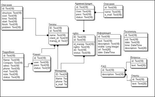 Сущность «Заказы» и связанная с ней сущность «Описание» определяют атрибуты необходимые для описания заказов. Атрибут client_id и manag_id необходимы для связывания сущности «Заказы» с сущностями «Клиент» и «Менеджер». Сущность «rights» необходима для назначения прав и областей доступа для менеджера и администрации. Сущность «Администрация» и связанная с ней сущность «Описание» содержит атрибуты для описания администратора системы. Атрибуты«User», «pass» и «status» необходимы для авторизации и аутентификации пользователя в системе.