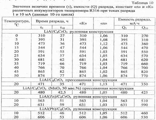 электродов. Результаты испытаний опытных образцов и макетов литиевых аккумуляторов прессованной и рулонной конструкции на основе систем: LiAl/C8