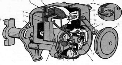 Ротор виконаний з окремих деталей. Постійний магніт ротора 13 виготовляється у вигляді циліндра із нікель-алюмінієвої сталі (сплав ЖНА) або оксидно-барієвих сплавів. На постійний магніт 13 напресовують пакет пластин 15 і дві півосі 14. В пакеті пластин встановлюють полюсні башмаки: М—північ (Пн) і 8—південь (Пд). Всі ці деталі скріплюються цинковим сплавом.