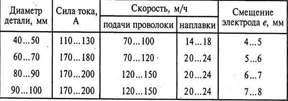 Режимы наплавки, выполняемой на цилиндрических деталях, приведены в табл. 6.