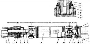 1 – удлинитель картера коробки передач; 2 – вал вторичный; 3 – грязеотражатель удлинителя; 4, 5 – резиновые сальники; 6 – грязеотражатель скользящей вилки; 7 – вилка скользящая; 8 – пластина балансировочная; 9 – труба карданного вала; 10 – вилка; 11 – вилка фланцевая; 12 – болт; 13 – фланец ведущей шестерки заднего моста; 14 – шайба пружинная; 15 – гайка; 16 – мост задний; 17 – корпус игольчатого подшипника; 18 – проушина вилки; 19 – игла; 20 – кольцо стопорное пружинное; 21 – шайба уплотняющая с тормозным торцем; 22 – сальник карданного подшипника резиновый; 23 – крестовина кардана.