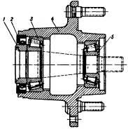 Ступицы. В ступицах передних колес (рисунок 3.5) установлены конические подшипники. Сальник 2 ступицы работает по упорному кольцу 1, напрессованному на цапфу. Правильно собранная и отрегулированная ступица должна обеспечивать легкое вращение колеса, не нагреваться при езде и иметь осевой люфт 0,02-0,12 мм.