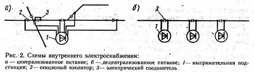 Внутреннее электроснабжение выполняется в виде централизованного (рис. 2, а) или децентрализованного (рис. 2, б) питания контактной сети. Централизованную схему применяют при подстанциях, имеющих большую мощность, позволяющую питать весь примыкающий к ней район контактной сети, которая состоит из секций, расположенных в разном удалении от подстанции.