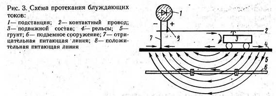 Отличительной особенностью работы рельсовой сети является малая изоляция рельсов от земли. Земля - хороший проводник электрического тока, поэтому часть тока, возвращающаяся на подстанцию, ответвляется в землю и проходит как по земле, так и по подземным металлическим сооружениям (трубам каркасам подземных сооружений, броне и оболочкам кабелей и др.). Токи утечки из рельс в землю называются блуждающими токами (рис. 3).