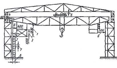 1-высота кабины; 2-высота обшивки кабины; 3-зазар между кабиной и посадочной площадкой; 4-расстоянеи между колоннами зданий и концевой балкой моста; 5-зазор между наивысшей точкой механизмов и перекрытием ферм зданий; 6-расстояние между стенкой здания и стенкой кабины; 7-расстояние между ступенями лестницы; 8-ширина посадочной лестницы.
