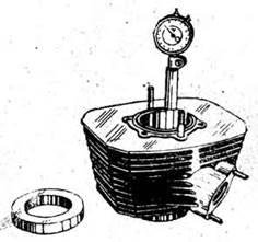 а) вставить кольцо в цилиндр и щупом замерить величину зазора в стыке кольца, в новом цилиндре зазор должен быть равным 0,25...0,50 мм, при меньшем зазоре концы кольца необходимо, подпилить;