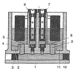 1 - сполучний канал між секціями поплавцевої камери; 2,11 - секції поплавцевої камери; 3,10 - заглушки; 4,9 - топливозаборные відчини; 5,8 - паливні жиклери головних дозуючих систем; 6,7 - повітряні жиклери емульсивних трубок.