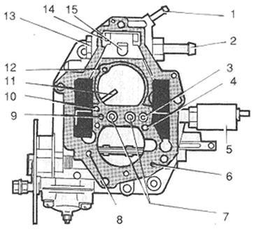 1 - гвинт регулювання складу суміші на неодруженому ходу; 2 - щілинний перехідний отвір; 3 - отвір забору повітря, що емульсує, в систему неодруженого ходу: 4 - головний паливний жиклер первинної камери; 5 - емульсивний колодязь головної дозуючої системи первинної камери; 6 - перехідний отвір вторинної камери; 7 - паливний жиклер перехідної системи вторинної камери; 8 - повітряний жиклер перехідної системи; 9 - проти-дренажний отвір; 10 - повітряний жиклер системи неодруженого ходу; 11 - отвір паливного жиклера неодруженого ходу; 12 - паливний жиклер системи неодруженого ходу; 13 - голка клапана з пластмасовим наконечником; 14 - електромагнітний клапан; 15 - емульсивний канал.
