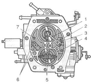 1 - паливний жиклер эконостата; 2 - головний паливний жиклер первинної камери; 3 - демпфуючий жиклер; 4 - кулачок на осі дросельної заслінки первинної камери: 5 - всмоктуючий клапан прискорювального насоса; 6 - пружина ходу всмоктування; 7 - важіль приводу прискорювального насоса;