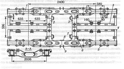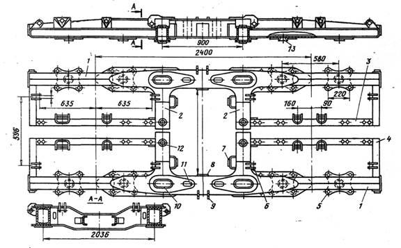 балки отштампованы из листов толщиной 14 мм корытообразного профиля. У продольных балок этот профиль открытый, а в поперечных закрыт приваренной планкой толщиной 8 мм. Для подвешивания деталей тормозной рычажной передачи к средним 2