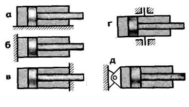 Рис. 4.2. Тверде (а...в) і шарнірне (м, д) кріплення корпуса гідроциліндра за корпус (а, г), задню (б, д) і передню (в) кришки