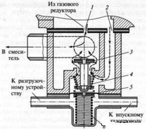 1, 2 - жиклеры соответственно экономичной и мощностной регулировок; 3 клапан; 4, 6 - пружины; 5 - мембрана.