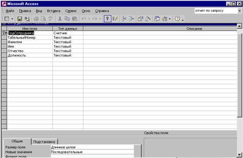 Например: тип данных для поля «КодСотрудника» – счетчик, а для поля «Фамилия» – текстовый (см. рис.1.2). Чтобы определить ключевое поле необходимо выделить его и нажать инструмент с рисунком ключа.