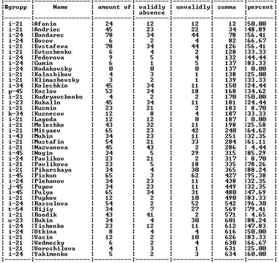 Данная программа предназначена для удобной обработки информации, содержащей сведения о студентах, код группы, фамилия студента, количество пропущенных занятий и число оправданных пропусков, составления и вывода на экран и в файл отчётных таблиц, задаваемый пользователем.