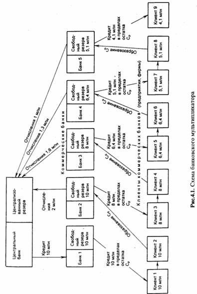 В соответствии со схемой деньги на расчетных счетах клиентов 2, 4, 6, 8 и т. д. (всех четных клиентов) остаются нетронутыми и поэтому общая сумма денег на расчетных (депозитных) счетах составит, в конечном счете, величину, многократно большую, чем первоначальный депозит - 10 млн. руб., образовавшийся при выдаче ссуды клиенту 1. Однако деньги на депозитных счетах могут увеличиться не более чем в 5 раз, поскольку величина коэффициента мультипликации, представляющая собой отношение образовавшейся денежной массы на депозитных счетах к величине первоначального депозита, обратно пропорциональна норме отчислений в централизованный резерв.