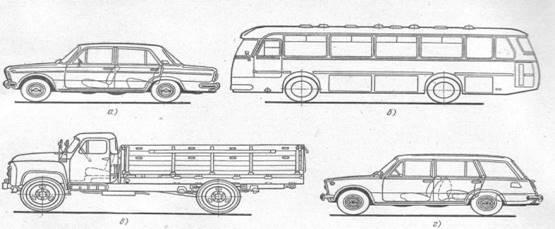 Рис. 2. Основные типы транспортных автомобилей: о — легковой автомобиль ВАЗ-2103; 6 — автобус ЛАЗ-697М; в — грузовой автомобиль ГАЗ-53А; г — грузо-пассажирский автомобиль ВАЗ-2102