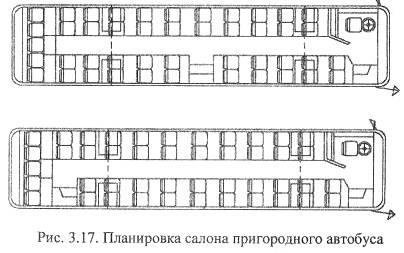 Пригородные автобусы, предназначены для перевозки пассажиров по маршрутам, связывающим город с пригородом. Планировка салона автобусов (рис.3.17) предусматривает четырехрядное расположение сидений, что позволяет увеличить количество сидячих мест. Из-за большего расстояния перегонов на маршрутах и меньшего по величине пассажирообмена на остановочных пунктах по сравнению с городскими перевозками размер накопительных площадок и количество дверей в салоне автобусов могут быть сокращены. Пригородные автобусы оборудуются одной или двумя дверями шириной 700 мм. В салоне автобуса предусматривается специальное для кондуктора место, оборудованное дополнительным обогревом. Хорошие динамические качества автобусов обеспечивают более высокие скорости движения. Кабина водителя изолирована от пассажирского салона.