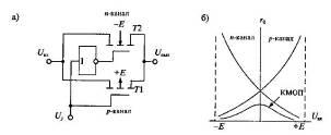 При увеличении входного напряжения сопротивление р-канального транзистора увеличивается, а n-канального уменьшается. В результате параллельное соединение этих транзисторов имеет почти неизменное сопротивление r0 в открытом состоянии, как показано на рисунке 7б. поскольку транзисторы ключа управляются сигналами противоположной полярности, то импульсы помех взаимно компенсируются, что позволяет снизить уровень входных сигналов.