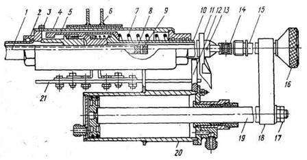 После этого все детали регулятора займут исходное положение, а винт 1 будет перемещен внутрь тягового стержня 17