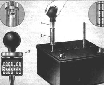 Плотность электролита измеряют денсиметром или плотнометром (рис. 3). Денсиметр имеет цену деления 10 кг/м3