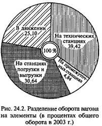 На рис. 24.1 представлены две схемы оборота вагона. На первой из них рассмотрен случай, когда выгрузку и последующую погрузку осуществляют на одной и той же станции, т.е. при сдвоенных грузовых операциях. Вторая схема соответствует случаю, когда погрузку и выгрузку выполняют на разных станциях и имеют место груженый и порожний рейсы вагона. Оборот вагона представляет собой сумму времени нахождения вагона в поездах на участках (в движении и на промежуточных станциях) и транзитного вагона — на технических станциях (в транзитных поездах и под переработкой), а также станциях погрузки и выгрузки. Разделение оборота вагона на элементы (в процентах общего оборота в 2003 г.) представлено на рис. 24.2. В указанном году оборот вагона по сети составил 8,35 сут . Оборот вагонов имеет важное значение для экономики в целом: им определяются не только качество использования подвижного состава и транспортные издержки, но и продолжительность перевозки грузов.