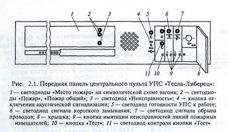 Основной узел УПС - центральный пульт (рис. 2.1) - служит для подачи оптического и акустического сигналов о возникновении пожара в вагоне с указанием помещения, где это произошло, для проведения самодиагностики УПС, подачи в провода между центральным пультом и датчиками напряжения 24 В, постоянного контроля за состоянием датчиков и подачи сигнала об их неисправности, подачи сигнала о готовности УПС к работе, исключения ложных сигналов о возникновении пожара.