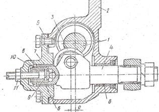 ) содержит глобоидальный червяк 1, установленный на подшипниках в картере 2, ролик 3, закреплённый с помощью оси 4 в пазу вала 5 сошки и крышки 6 картера, в резьбовое отверстие которой ввёрнута втулка 7 с внутренней и наружной резьбами, которые могут быть различного направления или одного направления, но с различным шагом. На хвостовике 8 головки вала сошки выполнена наружная резьба, и этот хвостовик ввернут в резьбовую втулку 7, являющуюся также его опорой. Втулка 7 законтрена гайкой 9. Для смазки механизма в качестве маслоналивного канала используется закрываемое пробкой 10 резьбовое отверстие втулки 7 и центральное сквозное отверстие в резьбовом хвостовике головки вала сошки, выходящее в паз головки вала сошки. Осевое перемещение вала сошки при его вращении может быть осуществлено также с помощью закреплённого в резьбовом отверстии крышки винта, ввернутого в резьбовое отверстие хвостовика 8 головки вала сошки. Резьбовое соединение вала сошки с картером может быть осуществлено хвостовиком 11 с резьбой, ввернутым в горловину картера.