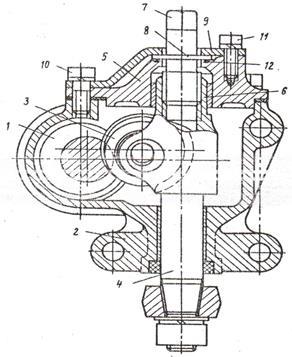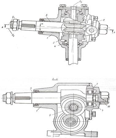 ), содержащий картер 1, в котором размещены глобоидальный червяк 2 и вал сошки 3. Червяк вращается в роликовых конических подшипниках 4, один из которых выполнен регулируемым. Вал сошки вращается в бронзовой втулке 5 горловины картера 1 и в роликовом цилиндрическом подшипнике 6 верхней крышки 7 картера 1. В щёчка вала сошки закреплен двухгребневый ролик 8, вращающийся на оси 9 и взаимодействующий с витками червяка 2. Щёчки выполнены параллельными оси вала сошки 3. Центр ролика 8 смещён относительно средней плоскости червяка 2 для обеспечения запаса на осевое регулировочное перемещение вала сошки 3. Регулировочное перемещение вала сошки происходит с помощью винта 10.