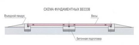 Весы монтируются на заранее подготовленный бетонный / железобетонный фундамент, залитый на песчано-гравийную подушку с учетом норм устройства фундаментов для зданий и сооружений, в соответствии со свойствами грунта в данном регионе. Заезд на весы осуществляется по металлическим, бетонным или комбинированным пандусам. Фундамент может быть как сплошным, расположенным под всей поверхностью весов, так и только под местами стыков платформ [2, с. 57].
