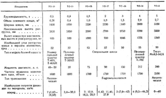 По грузоподъемности погрузчики разделяют на четыре класса: легкие (грузоподъемностью 0,5—2 т), средние (2—4 т), тяжелые (4—10 т) и большегрузные (свыше 10 т). Небольшие погрузчики (грузоподъемностью до 0,5 т) относят иногда к малогабаритным. По виду базового шасси погрузчики изготовляют на специальном шасси или тракторах и тягачах. По виду ходового оборудования они бывают на колесном или гусеничном ходах. По направлению разгрузчики ковша относительно стороны разрабатываемого штабеля погрузчики бывают с передней (фронтальные погрузчики), боковой (полуповоротные погрузчики) и задней (перекидные) разгрузчики.