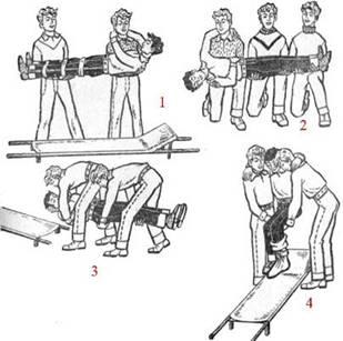 Рис.4: Приемы укладывания пострадавшего на носилки