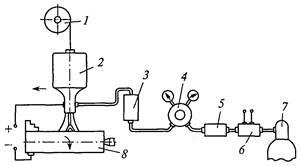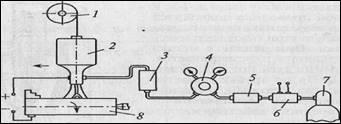 . Воздух в цилиндры прогретого двигателя подают либо через редуктор 1 прибора, либо непосредственно из магистрали по шлангу 4 в цилиндр 7 через штуцер 6, ввернутый в отверстие для свечи или форсунки, к которому присоединяется шланг 3 при помощи быстросъемной муфты 5.