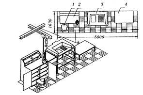 1 — стул подъемно-поворотный; 2 — верстак двухтумбовый; 3 — стол для мойки и сушки деталей; 4 — стеллаж-подставка; 5 — кран-балка, грузоподъемность 1 т