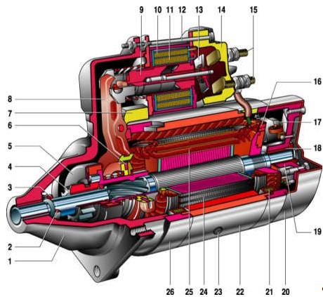 Стартер автомобиля представляет собой четырехполюсный, четырехщеточный электродвигатель постоянного тока со смешанным возбуждением, с электромагнитным включением шестерни привода и дистанционным управлением.