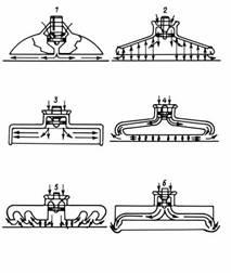 1 — с центральным соплом; 2 — камерная схема с юбкой (гибким ограждением); 3 — камерная схема с жесткими бортовыми ограждениями (скегами); 4 — схема без юбки с кольцевым соплом по периметру подушки; 5 — схема с лабиринтным уплотнением; 6 — схема с юбкой и кольцевым соплом по периметру подушки