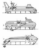 1 — амфибийное судно с воздушным винтом; 2 — полуамфибийное судно с водяным гребным винтом; 3 — судно с бортовыми ограждениями воздушной подушки (со скегами) и с Z-образным приводом на водяной гребной винт.