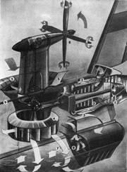 Общий вид (при снятой наружной обшивке) судна на воздушной подушке типа 5К4. В правом нижнем углу — вид на судно снизу в уменьшенном масштабе