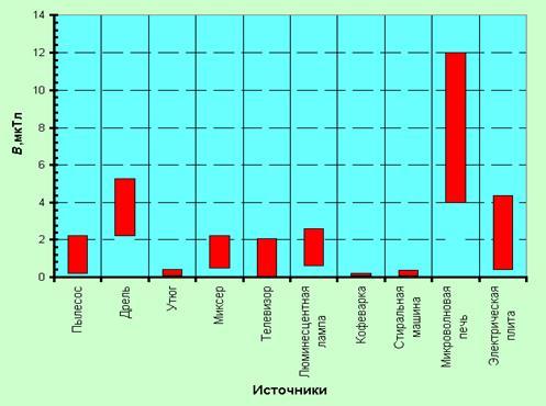 Наиболее мощными следует признать СВЧ-печи, аэрогрили, холодильники с системой “без инея”, кухонные вытяжки, электроплиты, телевизоры. Реально создаваемое ЭМП в зависимости от конкретной модели и режима работы может сильно различаться среди оборудования одного типа Все ниже приведенные данные относятся к магнитному полю промышленной частоты 50 Гц.