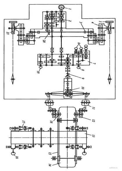 Скорость рабочего хода в диапазоне 10...300 м/ч регулируется изменением производительности насоса 8. При передвижении машины на транспортных скоростях (1,5...6,2 км/ч) крутящий момент от дизеля 1 передается ведущим звездочкам 21 гусениц 5 через главную муфту сцепления, тракторную коробку передач 2, коническую пару 20, бортовые редукторы 4 и фрикционы 3. Привод ротора 74осуществляется от вала отбора мощности тягача через раздаточный редуктор 7, конический редуктор 10 с дифференциальным механизмом, цепные шарнирные передачи 11 и консольные одноступенчатые редукторы 12. От редуктора 12 движение передается полувалам привода ротора, на которых закреплены приводные шестерни 18, зацепляющиеся с зубчатым венцом 15 ротора.