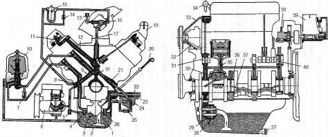 1 – піддон блок-катера; 2 – маслозабірник; 3 – масляний насос; 4 – редукційний клапан основної секції масляного насоса; 5 – зливальний клапан; 6 – компресор; 7 – перепускний клапан центрифуги; 8 – головна масляна магістраль; 9 – похилий канал у поперечній перегородці блок-катера: 10 – масляна центрифуга; 11 – вісь коромисел: 12 – канал для підведення масла в головку циліндрів; 13 – відвід для виміру тиску масла на двигунах колишніх марок; 14 – перепускний клапан фільтра турбокомпресора; 16 – підшипник ротора турбокомпресора; 17 – трубка зливання масла з турбокомпресора; 18 – вертикальний канал у поперечній перегородці блок-катера; 19 – маслозаливна горловина; 20 – масловимірювальний стержень; 21 – зворотний клапан системи передпускового прокачування масла; 22 – трубка для підведення масла до радіатора; 23 – трубка для зливання масла з радіатора; 24 – насос передпускового прокачування; 25 – перепускний клапан насоса передпускового прокачування; 26 – запобіжний клапан радіаторної секції насоса; 27 – пробка зливального отвору; 28 – радіаторна секція масляного насоса; 29 – основна секція масляного насоса; ЗО – масляна порожнина шатунної шийки колінчатого вала; 31 – отвір в передній шийці розподільного вала; 32 – отвір для зливання масла з водяного насоса; 33 – маслопровід для підведення масла до водяного насосу; 34 – сапун; 35 – масляний каналу шатуні; 36 – поперечний отвір у корінній шийці; 37 – отвір в щоці для підведення масла до шатунної шийки; 38 – опора шестерні паливного насоса;39 – паливний насос; 40 – отвір в задній шийці розподільного вала