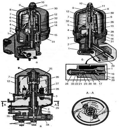 а – дизеля СМД-18Н; б – дизеля СМД-60; 1 – корпус; 2 – масловідвідна трубка; 3 – форсунка; 4 – остов ротора; 5 – масловідбивач; 6 – вісь ротора; 7 – кришка ротора; 8 – гайка ротора; 9 – упорна шайба; 10 – гайка ковпака; 11 – гайка; 12 – ковпак; 13 – насадка; 14 – ущільнююче кільце; 15 – прокладка; 16, 21 – канали в корпусі центрифуги для неочищеного і очищеного масла; 17 – кульковий канал; 18, 22 – пружини; 19 – запобіжний клапан; 20 – упор; 23 – шток; 24 – заглушка клапана; 25 – стакан що відокремлює порожнини очищеного і неочищеного масла; 26, 28 – отвори; 27 – запобіжна сітка; 29 – картер для зливання масла з форсунок; 30,31,32 – опорні шийки осі; 33 – прокладка; 34,35 – зливний і перепускний клапан