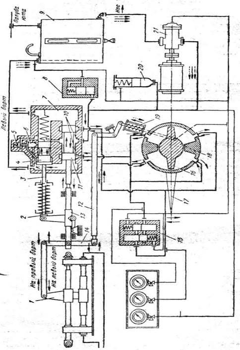 в нормальных условиях не работающая, но являющаяся демпфером при резких поворотах руля от ударов зыби. В последнем случае схемой предусматривается возможность перепуска рабочей жидкости из нагнетательных полостей рабочего цилиндра 16