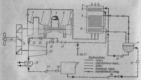 Тепловая схема ГТУ дана на рис. 3. Атмосферный воздух засасывается КНД 6 и последовательно сжимается в КНД и КВД 5. Затем в камере сгорания 4 при постоянном давлении происходит сжигание топлива, и образовавшийся при этом газ расширяется последовательно в ТВД 3, ТНД 2 и турбине винта (ТВ) 1. Отсюда газ поступает утилизационный котел 7, где отдает теплоту питательной воде. Пар из котла направляется в силовую паровую турбину 21, совместно с ТВ вращающую через упругие муфты и редуктор 24 гребной винт. Вся мощность ТВД и ТНД полностью потребляется соответственно КВД и КНД.