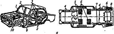 верх и низ соответственно левого и правого задних брызговиков; 10 —