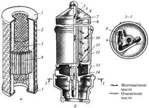 Составные части корпуса и проставка стянуты пустотелым стержнем и соединительным штуцером 14. При работающей системе масло нагнетается насосом через стержень 10 в корпус. При работе двигателя масляный насос нагнетает масло в маслоочиститель, под давлением масло просачивается сквозь поры бумажной ленты, оставляя на ее поверхности загрязняющие примеси. Пройдя в кольцевую щель между внутренним цилиндром и стержнем, очищенное масло поступает в проставку и выходит из фильтра в масляную магистраль для смазывания трущихся деталей.