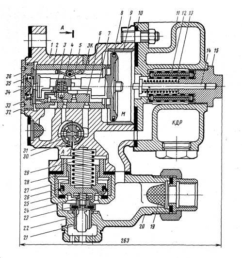 Магистральный поршень 7 образует две камеры: магистральную М и золотниковую ЗК. В хвостовике поршня имеются две выемки, в которых расположен отсекательный золотник 3 с осевым зазором около 0,3 мм и главный золотник 6 с зазором около 7,5 мм (холостой ход). Главный золотник прижат к зеркалу втулки пружиной 5, смещенной относительно продольной оси золотника на 4,5 мм и расположенной над магистральным каналом. С 1980 г. пружина 5 выпускается с двумя роликами. К зеркалу главного золотника пружиной 4 прижат отсекательный золотник. С левой стороны поршня 7 в корпус 1 ввернута заглушка 36, являющаяся упором для буферной пружины 35, которая вторым концом опирается на буферный стакан 33.