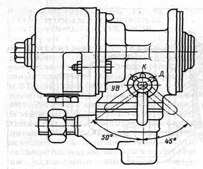 Ручка 18, закрепленная на хвостовике пробки 30 винтом 17, имеет три положения (рис. 2): Д — наклонное под углом 50° в сторону магистрального отвода, устанавливается при следовании в длинносоставных пассажирских (свыше 20 вагонов) и грузовых поездах; К - вертикальное для пассажирских поездов нормальной длины (не более 20 вагонов); УВ — наклонное под углом 45° в сторону привалочного фланца тормозного цилиндра — соответствует длинносоставному режиму, но ускоритель экстренного торможения выключен. Режимы К, Д и УВ предназначены для получения разного времени наполнения и отпуска тормозных цилиндров при экстренном торможении за счет сечения каналов в переключательной пробке.